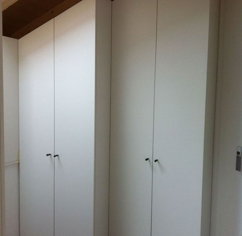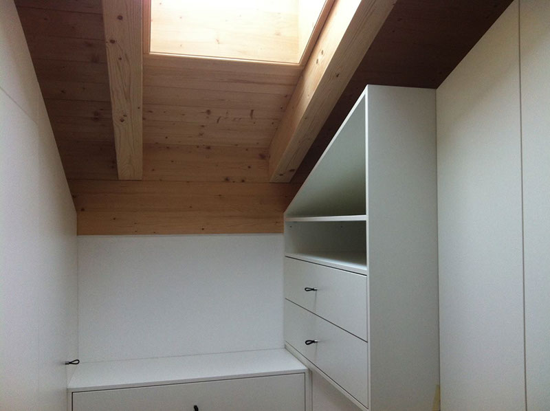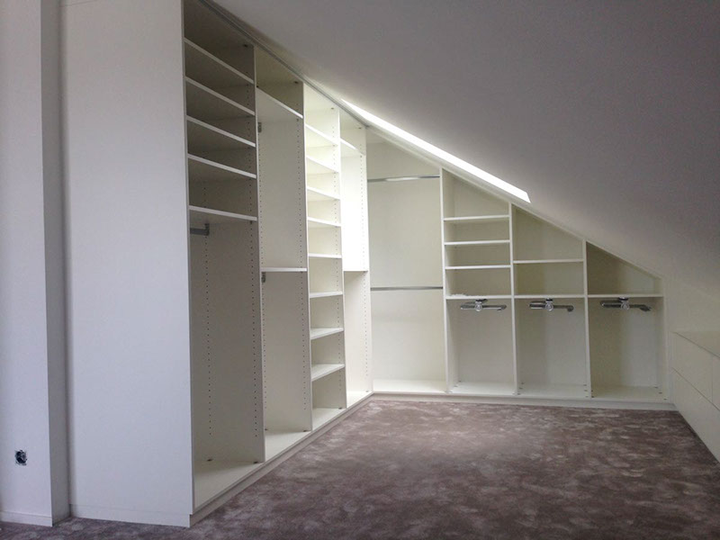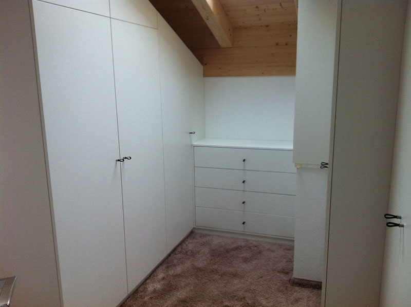 Ankleideschrank in Dachschräge, Austattung mit Schubladen und Drehtüren. Oberfläche weiß beschichtet, Griffe mit Lederschlaufen