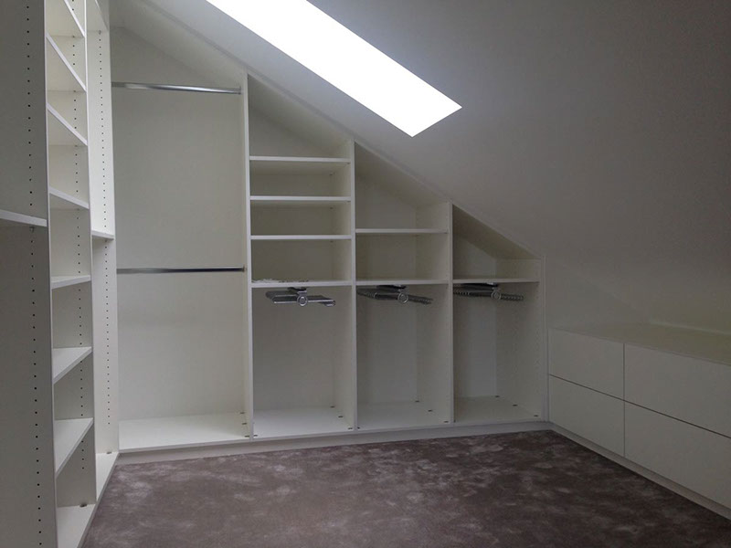 Ankleideschrank in Dachschräge, Oberfläche weiß beschichtet. Innenleben mit Kleiderstangen und Hosenauzügen, Schubladenkorpus rechts in Schräge mit Push Beschlägen für Griffloses Öffnen