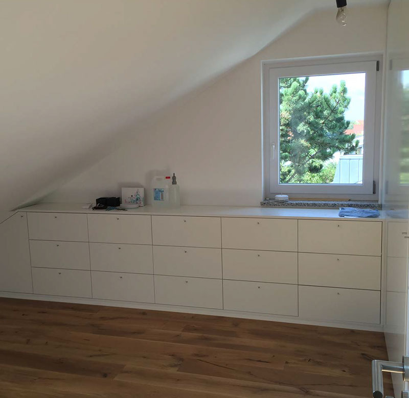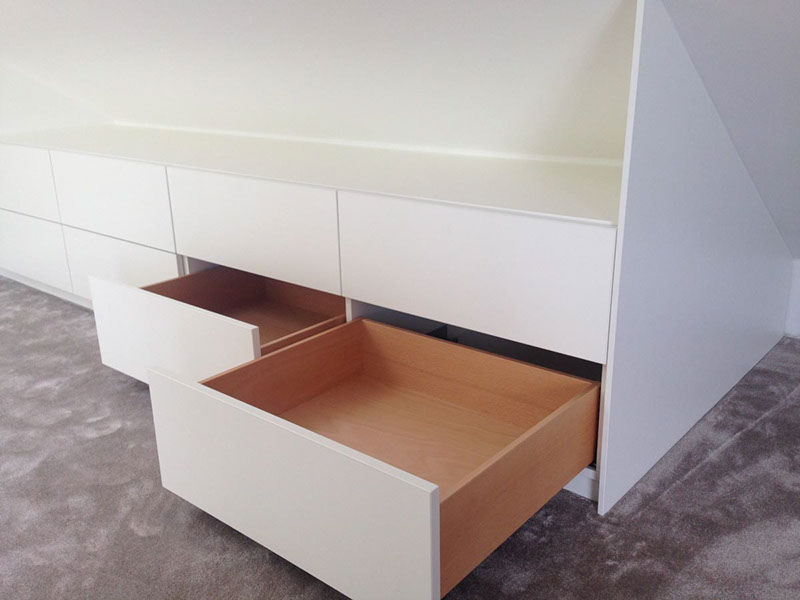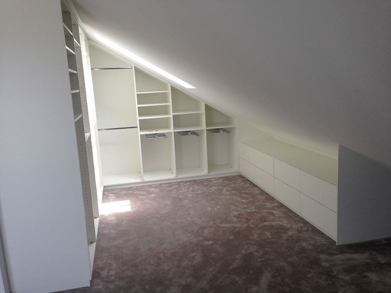 Ankleideschrank in Dachschräge, Oberfläche weiß beschichtet. Innenleben mit Kleiderstangen und Hosenauzügen, Schubladenkorpus rechts in Schräge mit Push Beschlägen für Griffloses Öffnen, Schubladen in Buche Massivholz lackiert