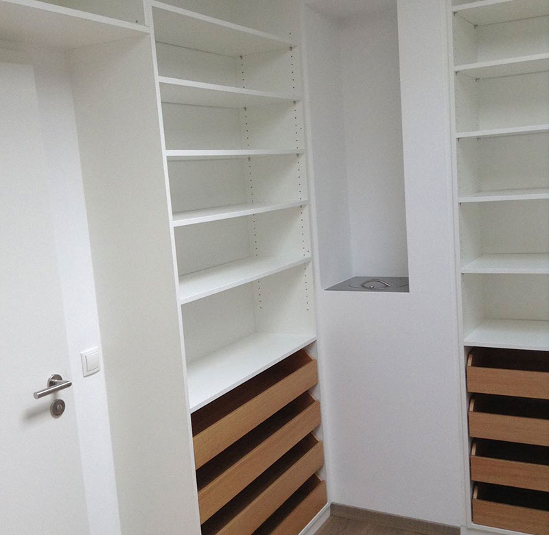 Ankleideschrank in weiß beschichteter Platte, Schubladen als Englischer Zug in Eiche Massivholz, Oberfläche lackiert. Innenleben mit verstellbaren Fächerm, Kleiderstangen und Kleiderlift. Wäscheabwurf mit Edelstahldeckel
