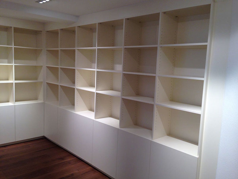 Sammlerschrank in cremefarbener Oberfläche, offene Fächer und Drehtüren unten