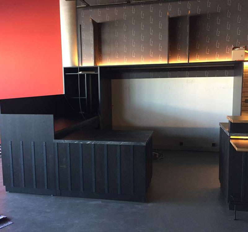Ladeneinrichtung Pfättisch Sicherheitstechnik, Verkaufstheke in grau beschichteter Platte Betonoptik