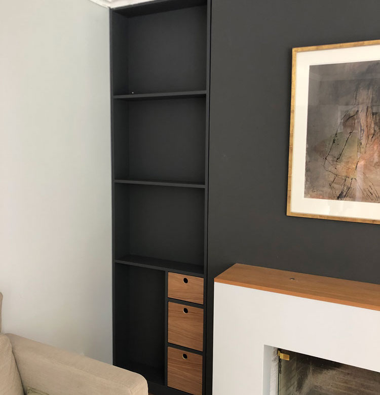Kaminholzregal grau lackiert, Schubladen Eiche Massivholz