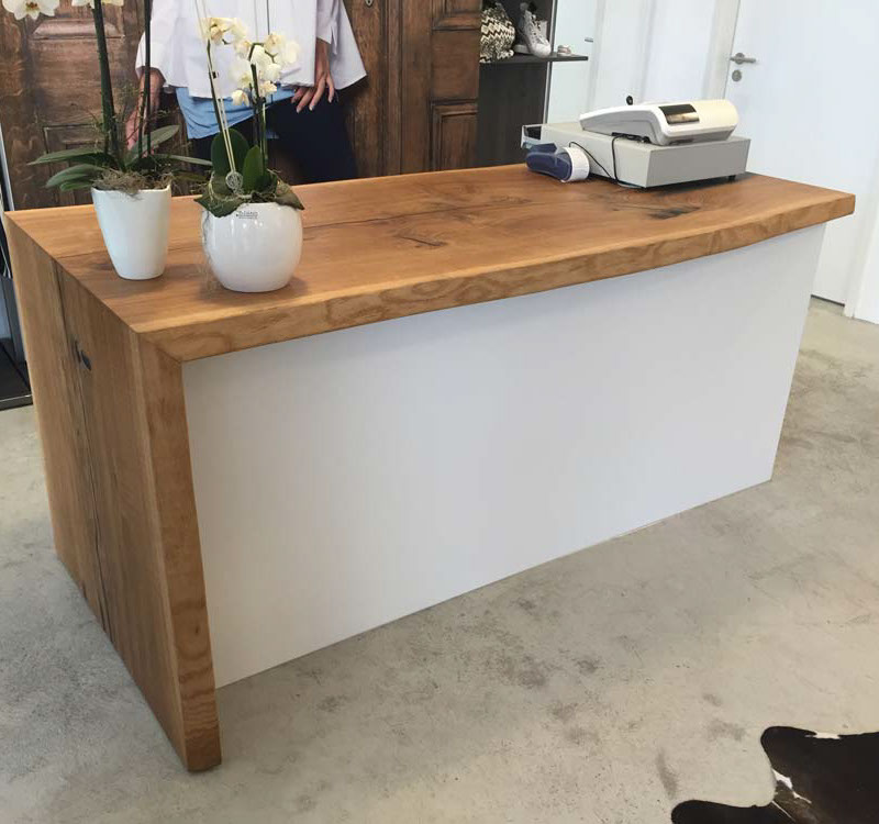 Ladeneinrichtung Bea la Moda, Ingolstadt, Kassentheke, Arbeitsplatte in Eiche Massivholz geölt, auf Gehrung verleimt, Platte beidseitig mit Baumkante