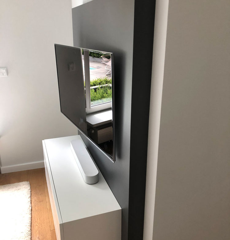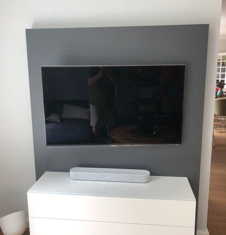 TV Board mit grau lackierter Rückwand und Board unten weiß lackiert mit zwei Schubladen