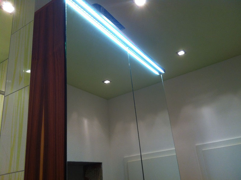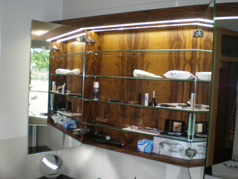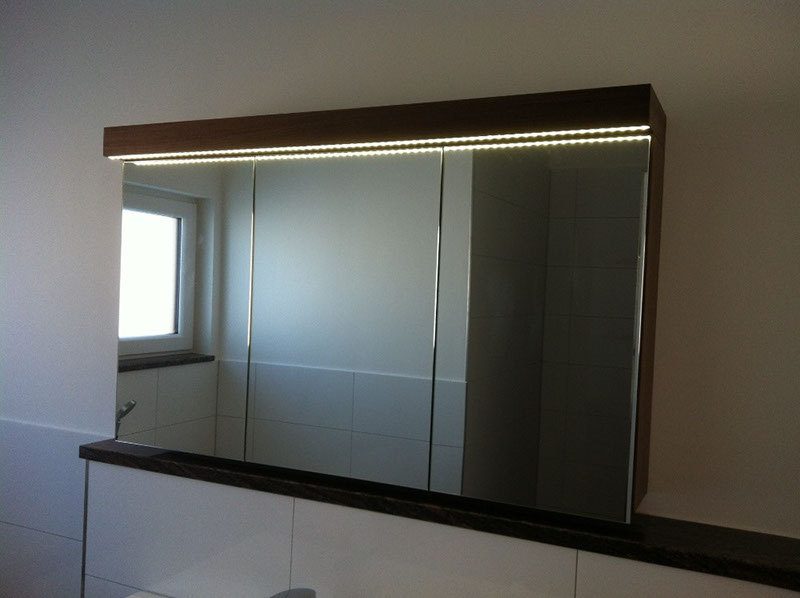 Spiegelschrank in furnierter Oberfläche, Türen in Doppelspiegel VSG und LED Beleuchtung oben