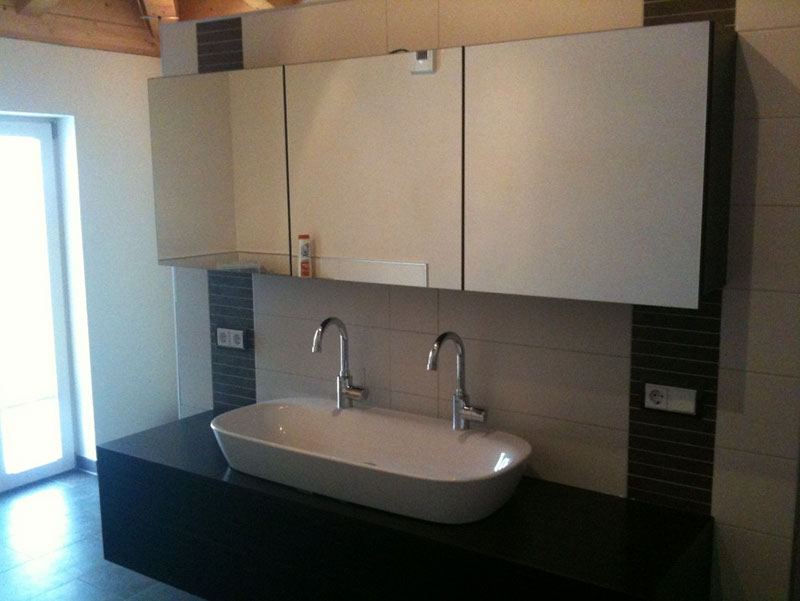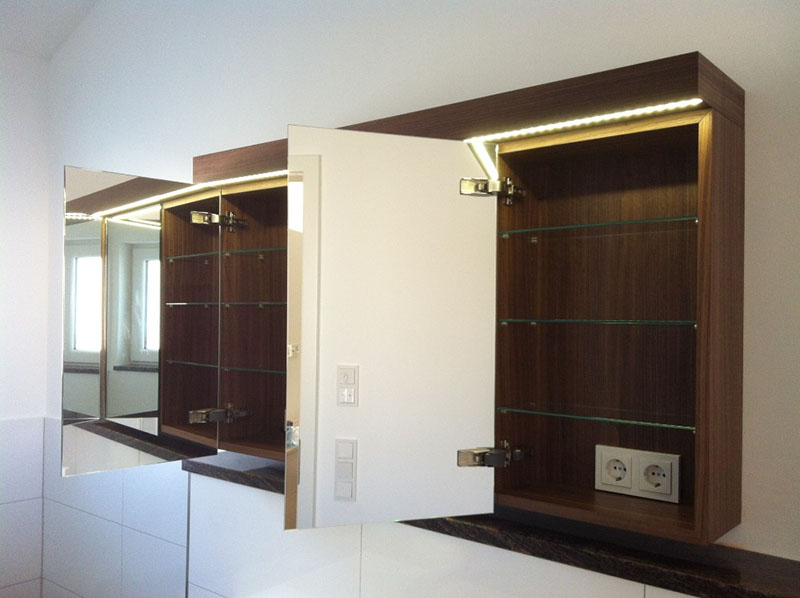 Spiegelschrank in furnierter Oberfläche lackiert, Türen in Doppelspiegel VSG, Steckdosen innen