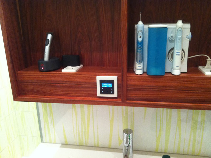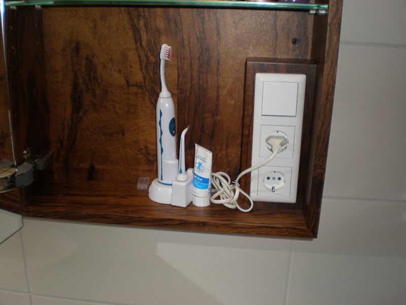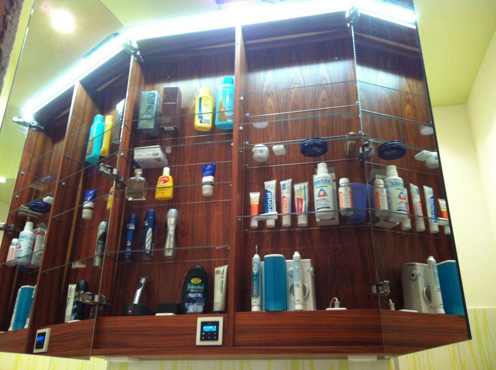 Spiegelschrank in Palisander furniert, Oberfläche lackiert mit Steckdosen und Radio