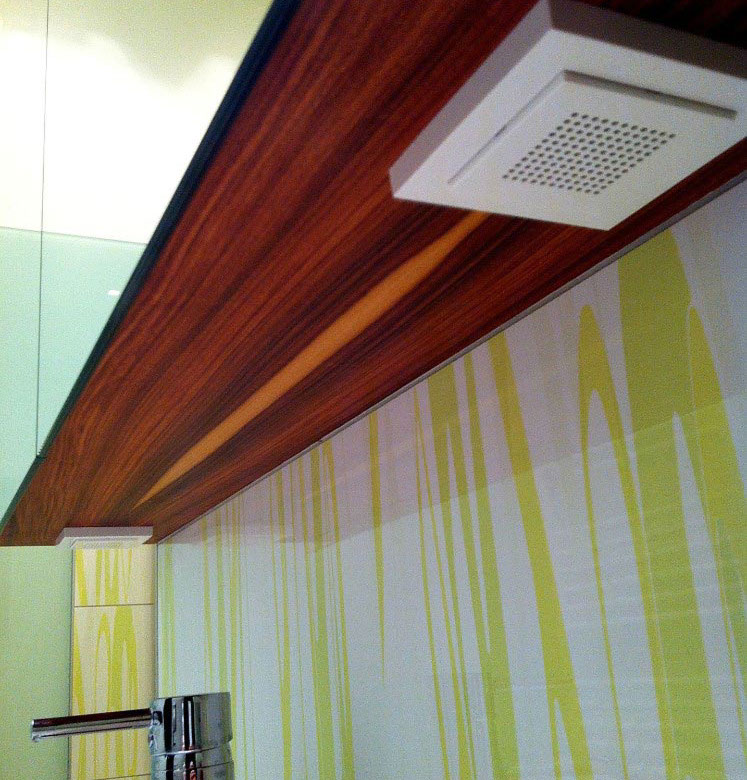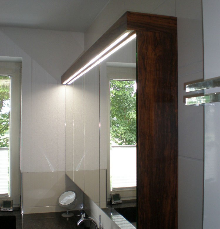Spiegelschrank in Palisander furniert und lackiert, Türen in Doppelspiegel VSG, Innen Steckdosen und Radio mit Lautsprechern auf der Unterseite