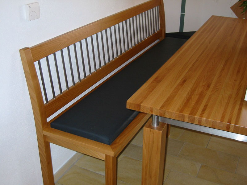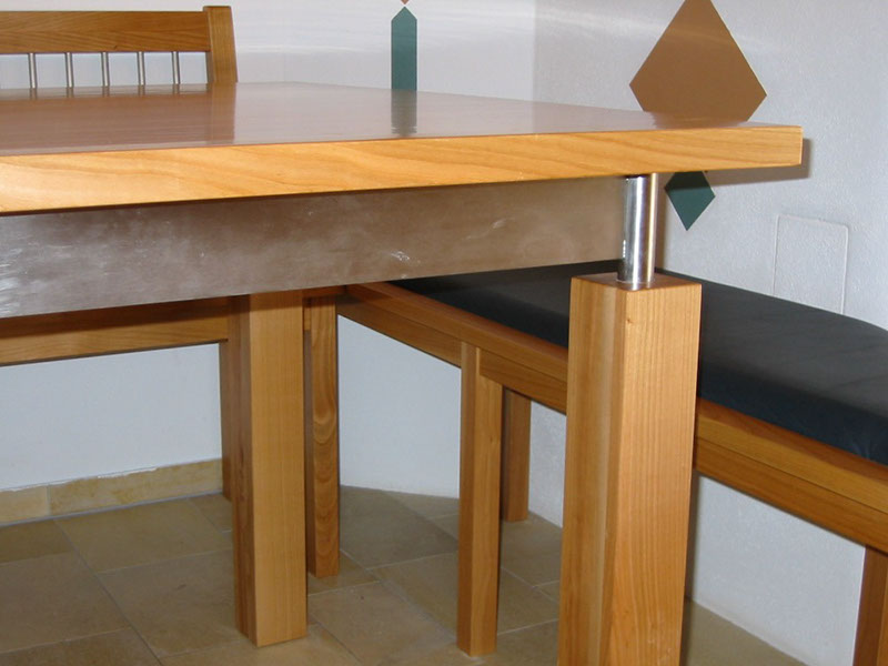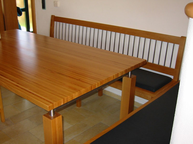 Esstisch und Bank in Kirsche Massivholz, Tischplatte in Streifen verleimt mit Edelstahlzargen auf der Unterseite, Oberfläche lackiert. Sitzbank mit Edelstahlsprossen, Sitzfläche mit Leder überzogen.