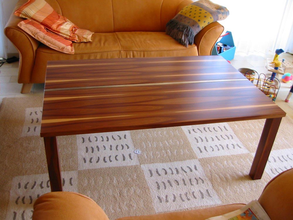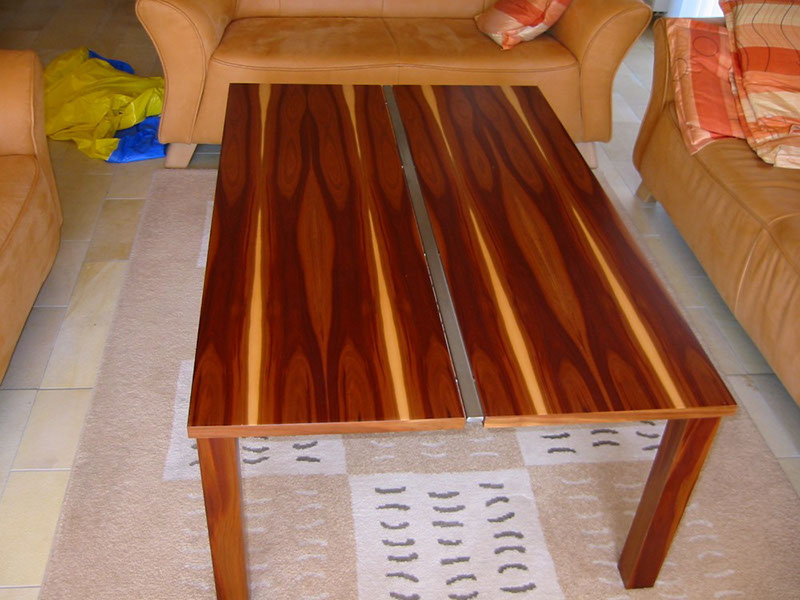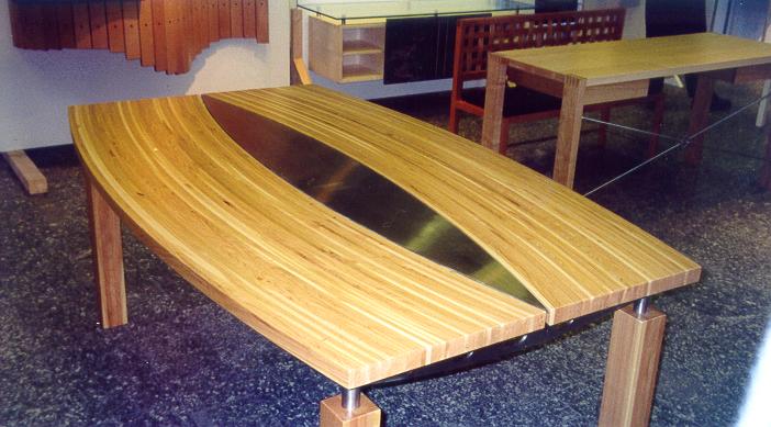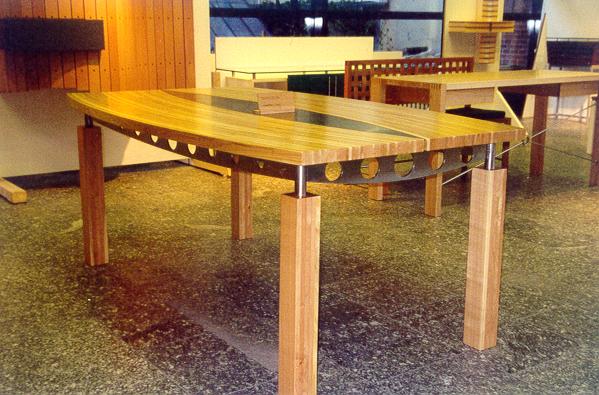 Projektarbeit Meisterschule München, Tischplatte mit Massivholzstreifen in Kirschbaum formverleimt, Edelstahlplatte in der Mitte