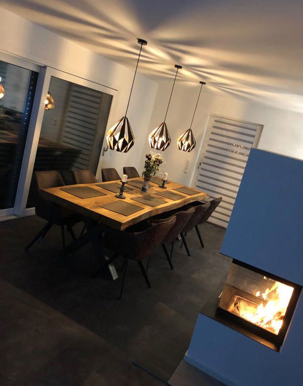 Wohnhaus in Kösching, Esstisch aus "einem Stück" in Eiche Massivholz, Risse an der Oberfläche mit Harz vergossen, Oberfläche geschliffen und geölt. Tischgestell Eigenanfertigung in Aluminiumplatten, Oberfläche silber eloxiert