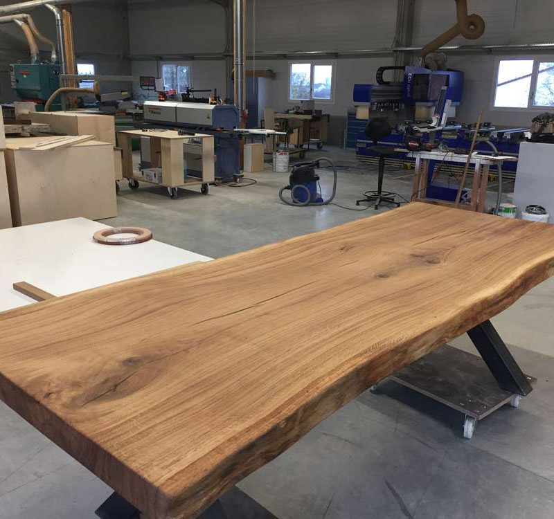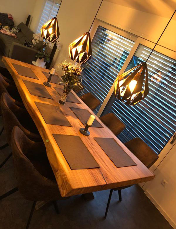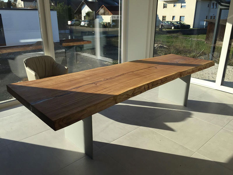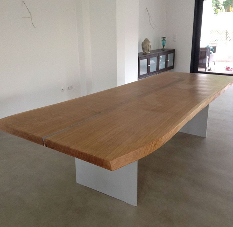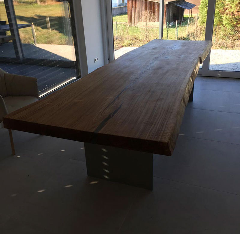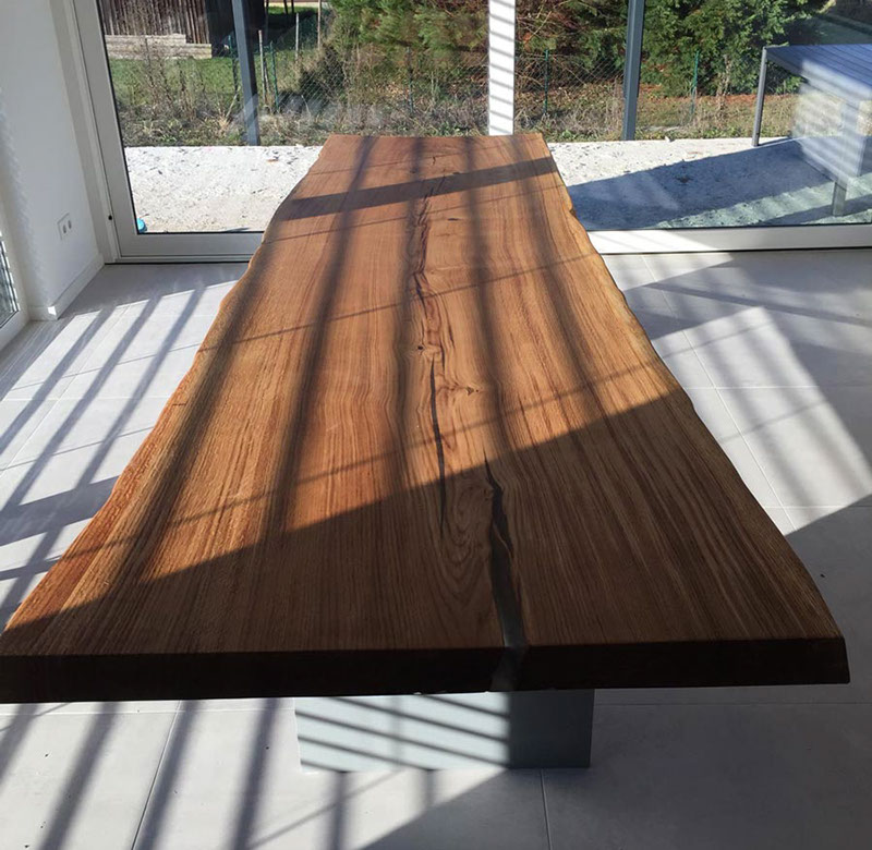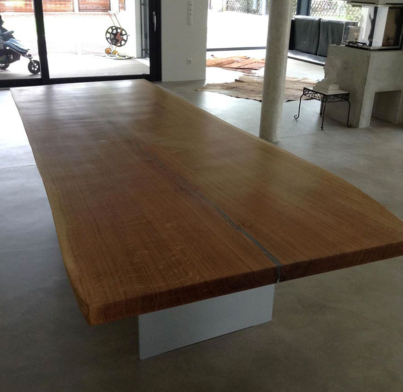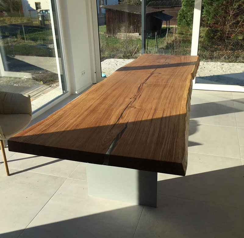 Esstisch in EIche Massivholz beim Kunden, Tischplatte aus einem Stück mit Baumkante auf beiden Seiten. Risse mit Epoxydharz vergossen, Oberfläche geölt. Tischplatte 2700 x 1080mm