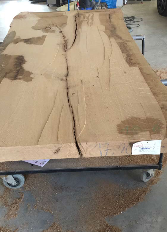 Ursprungszustand Tischplatte Eiche bei Anlieferung, Beginn der Bearbeitung...