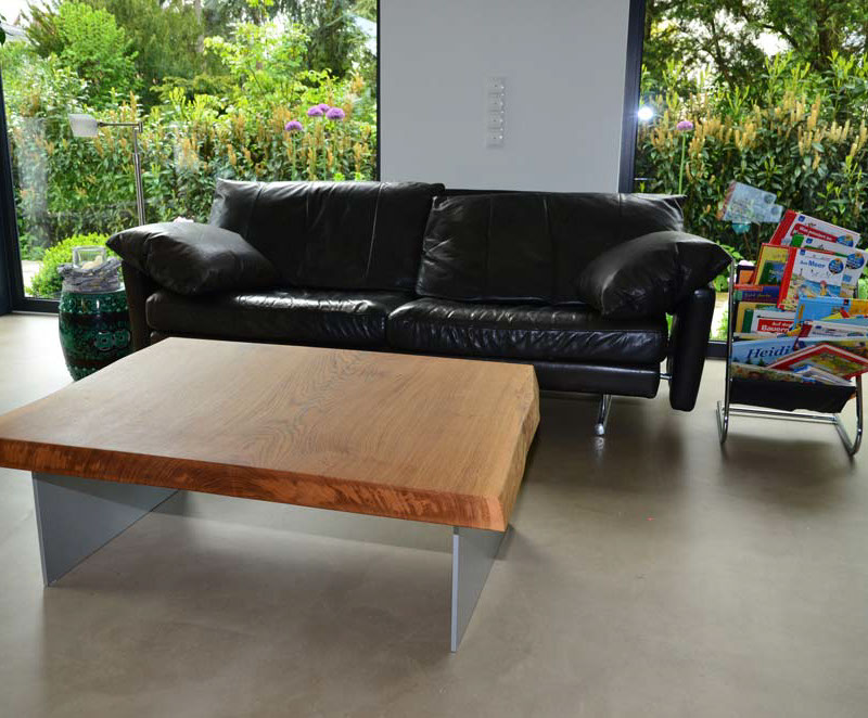 Wohnzimmertisch in Eiche Massivholz, Oberfläche geölt, Unterbau mit Zargen in Aluminium eloxiert